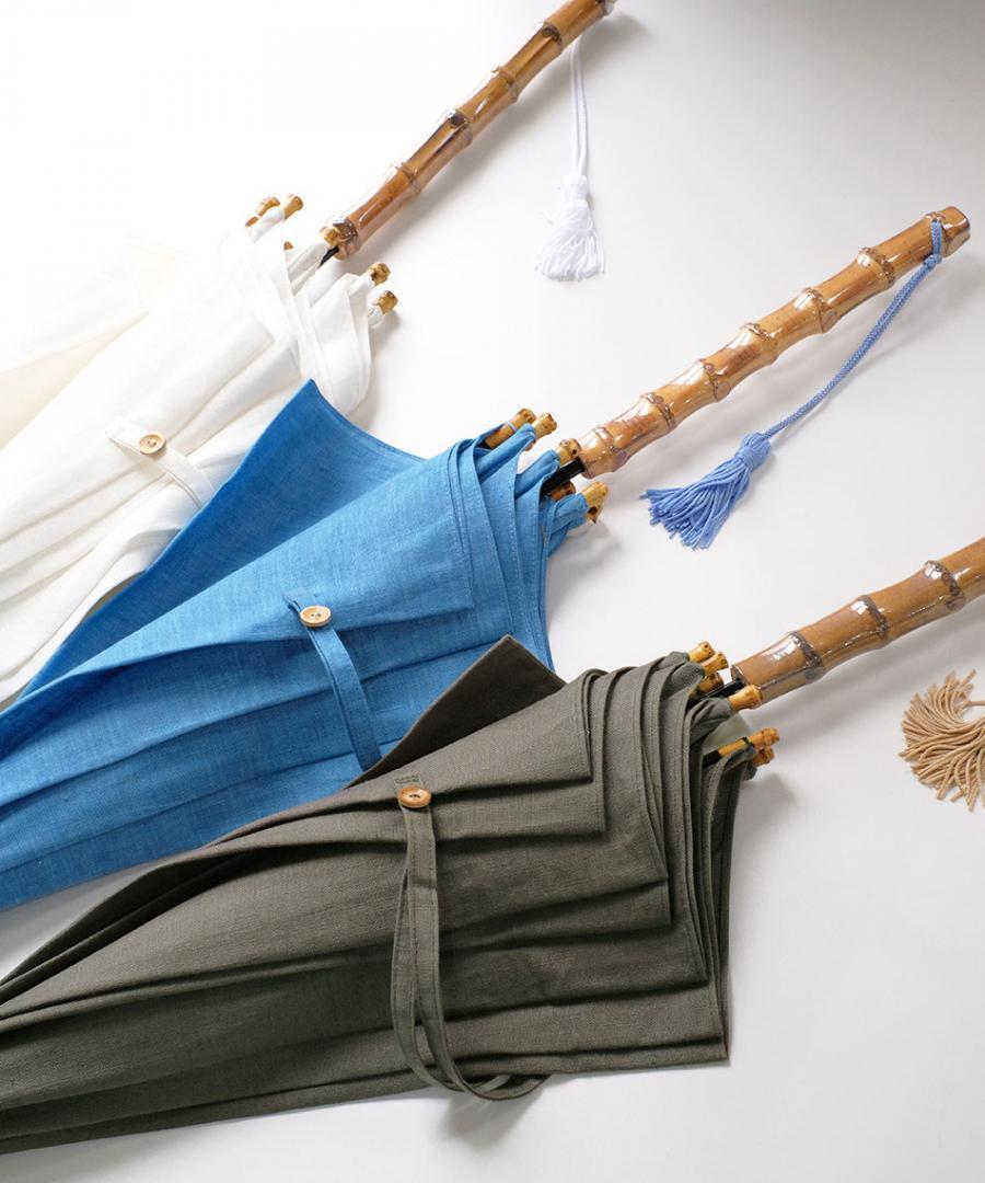 さわやかな白と水縹(水色)の2色は見た目にも持った感触も軽やかです。麻の素材感が涼しく、素敵な日傘です。