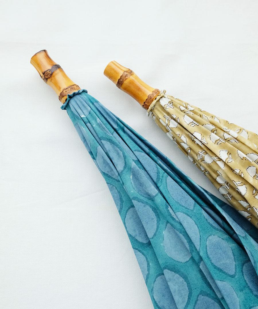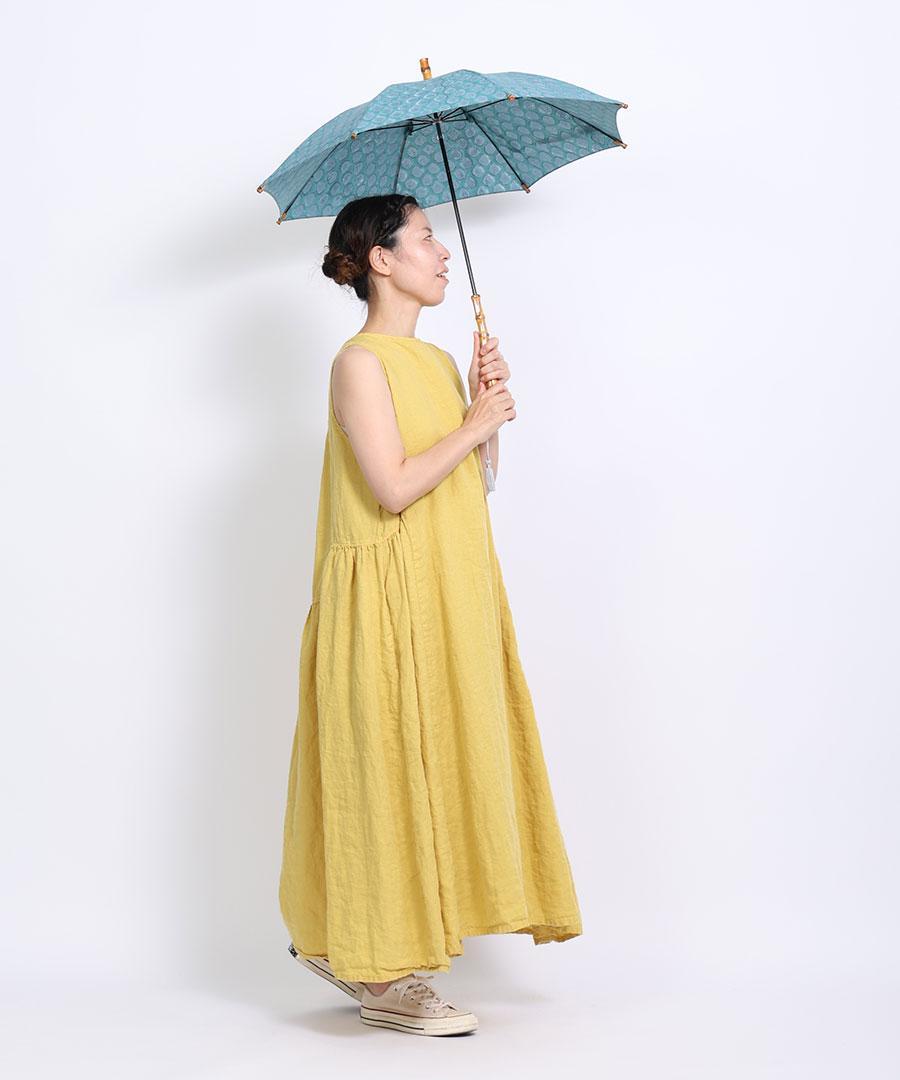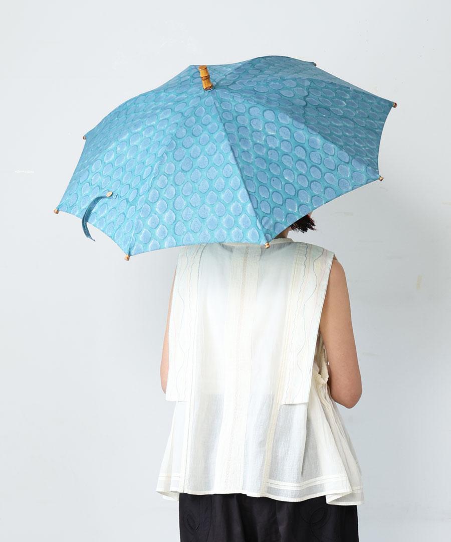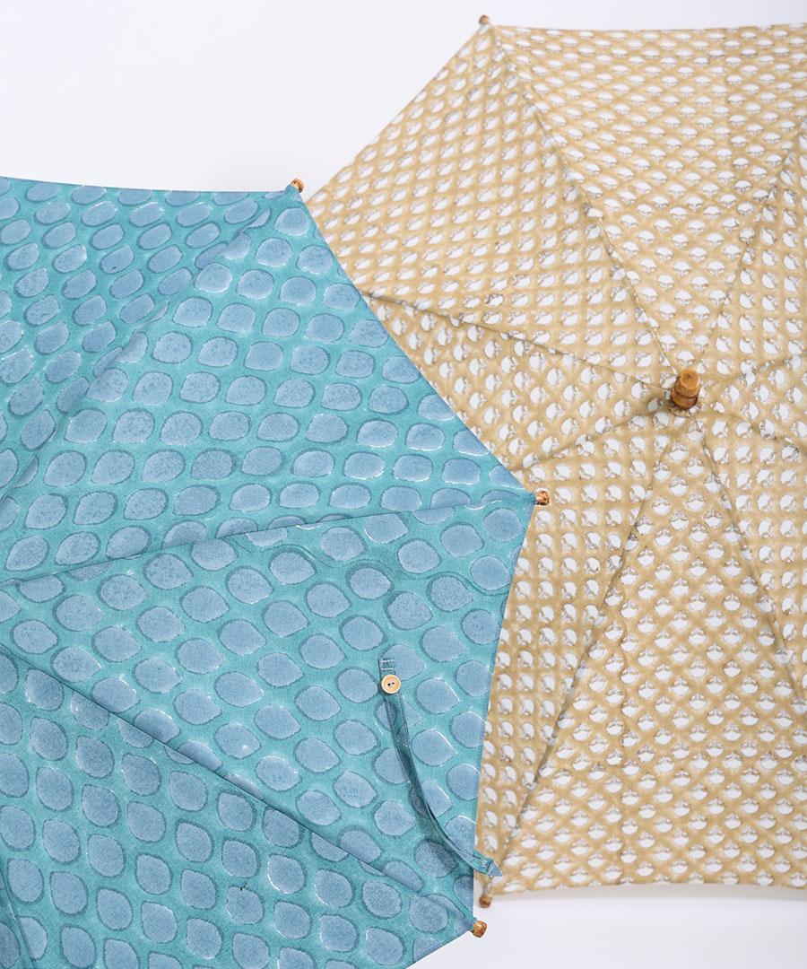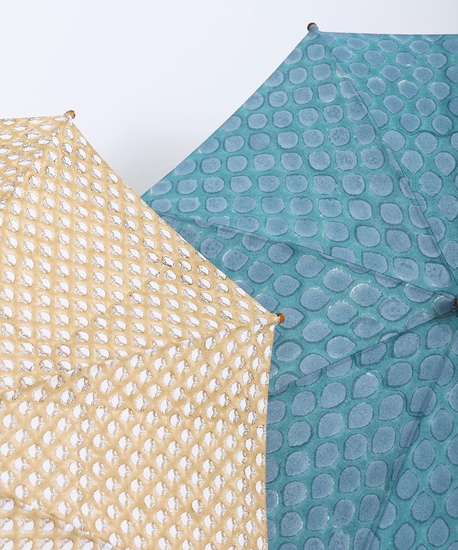 GREEN(dot)は青緑カラーに雫のようなドット模様で、ブロックプリントならではのズレや滲みの揺らめきが印象的です。