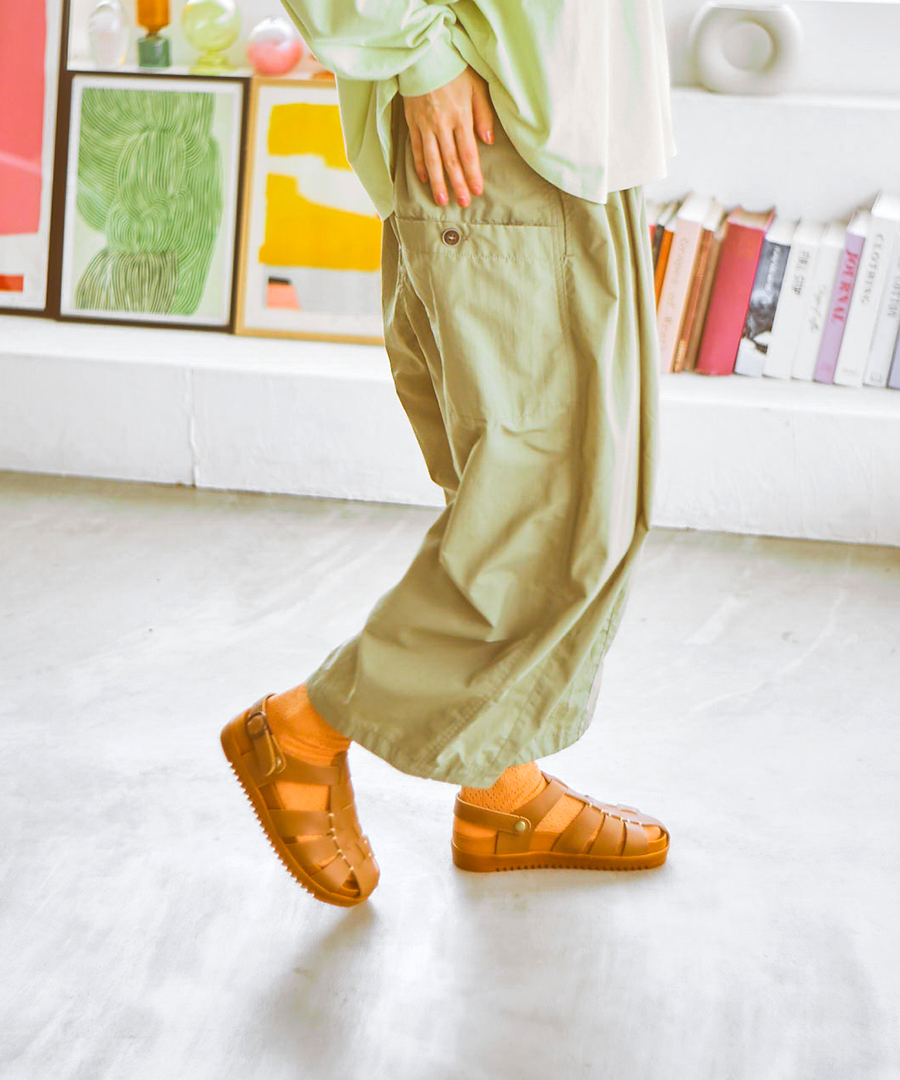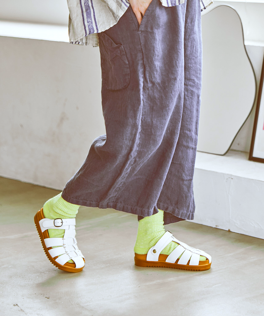 バックベルトとして足をしっかりホールドするのはもちろん、前に倒せばサッと履けるミュールへと早変わりします。バックル部分はゴム仕様なので、ベルトを外す手間なくスムーズに着脱できるのも嬉しいポイント。