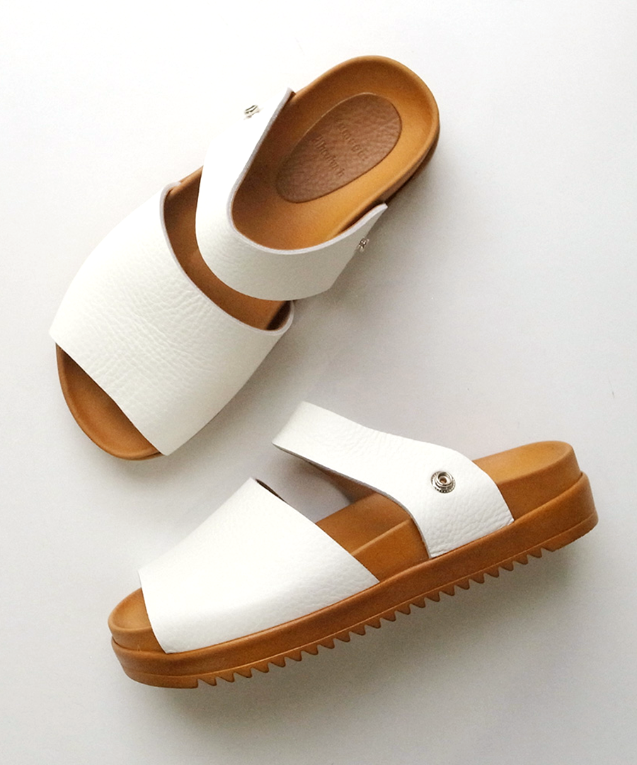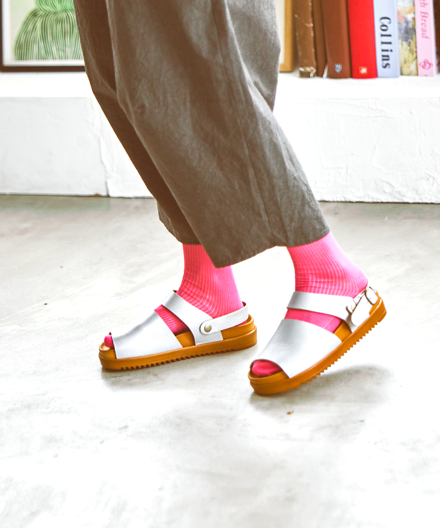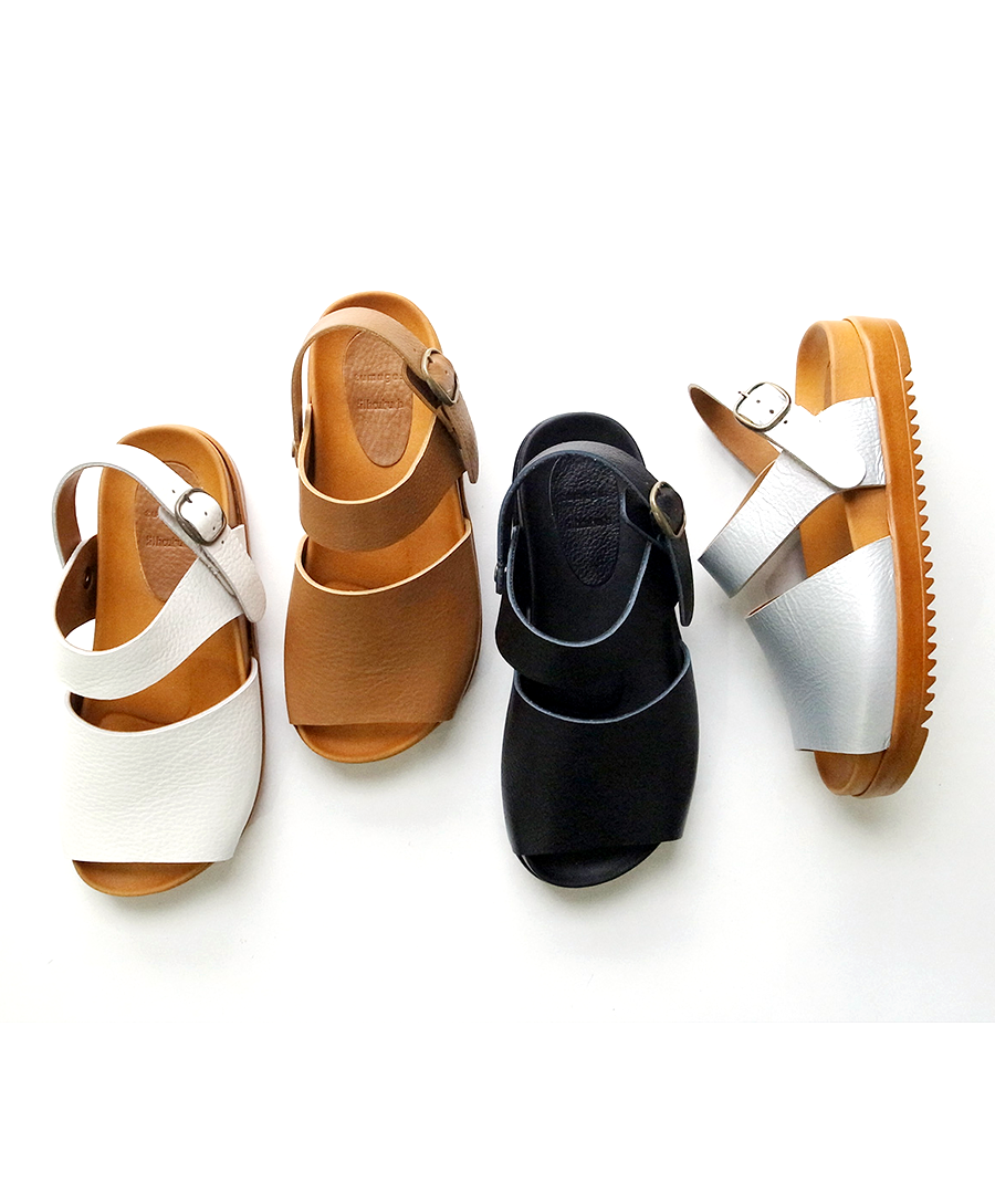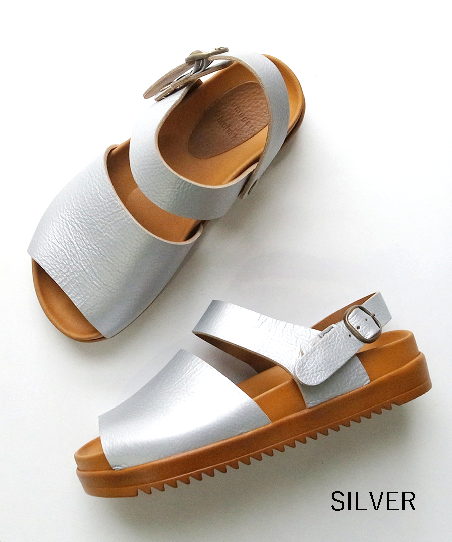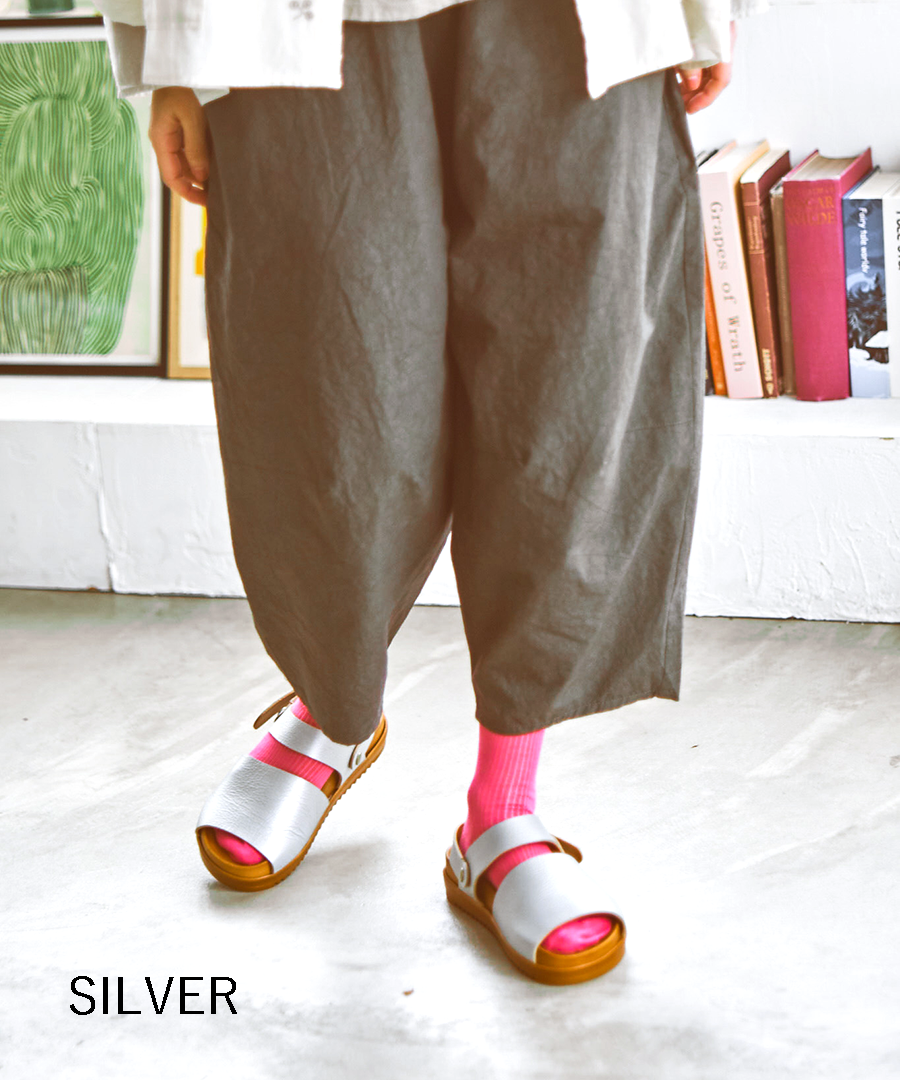 シボ感が印象的な柔らかい牛革で足に馴染みやすい、2タイプのサンダルを作りました。今年はベーシックカラーに加え、足元のアクセントになる「シルバー」が仲間入り。