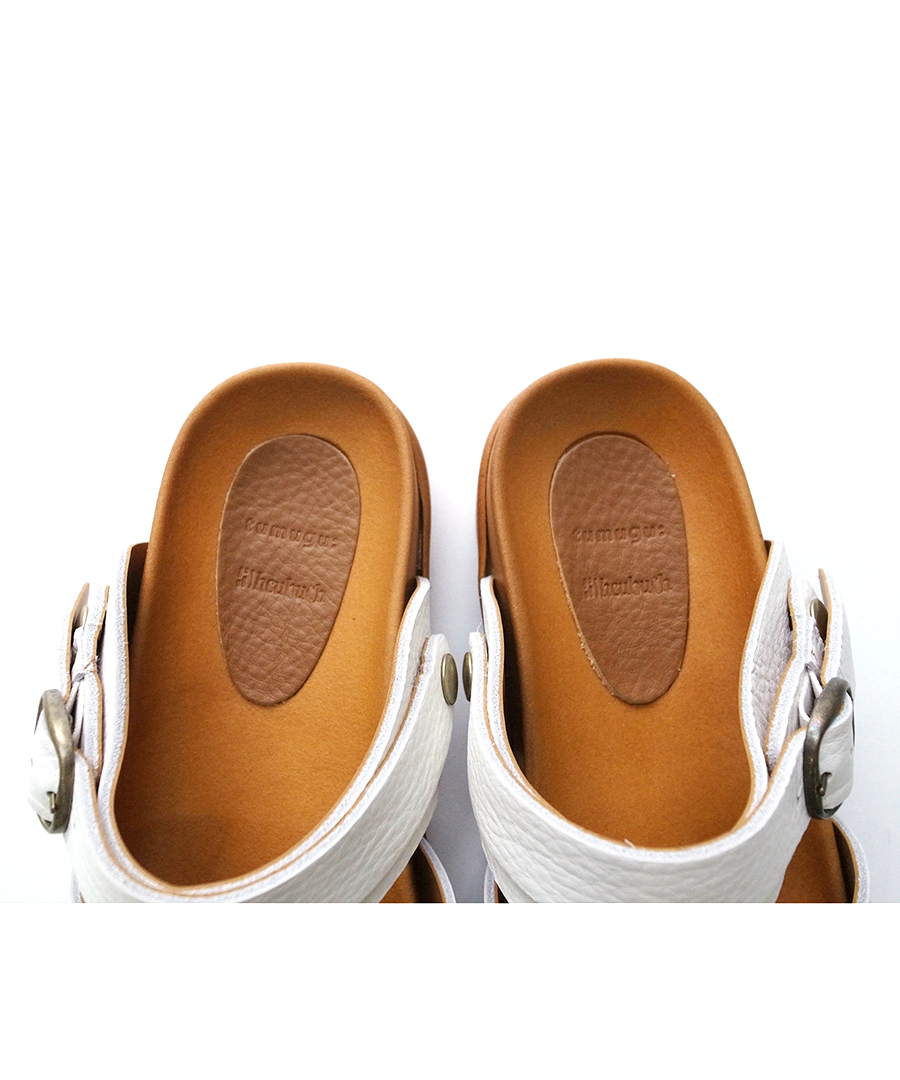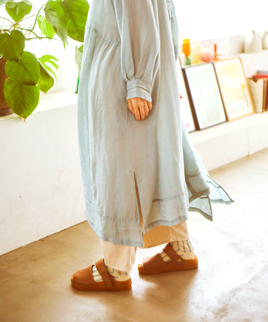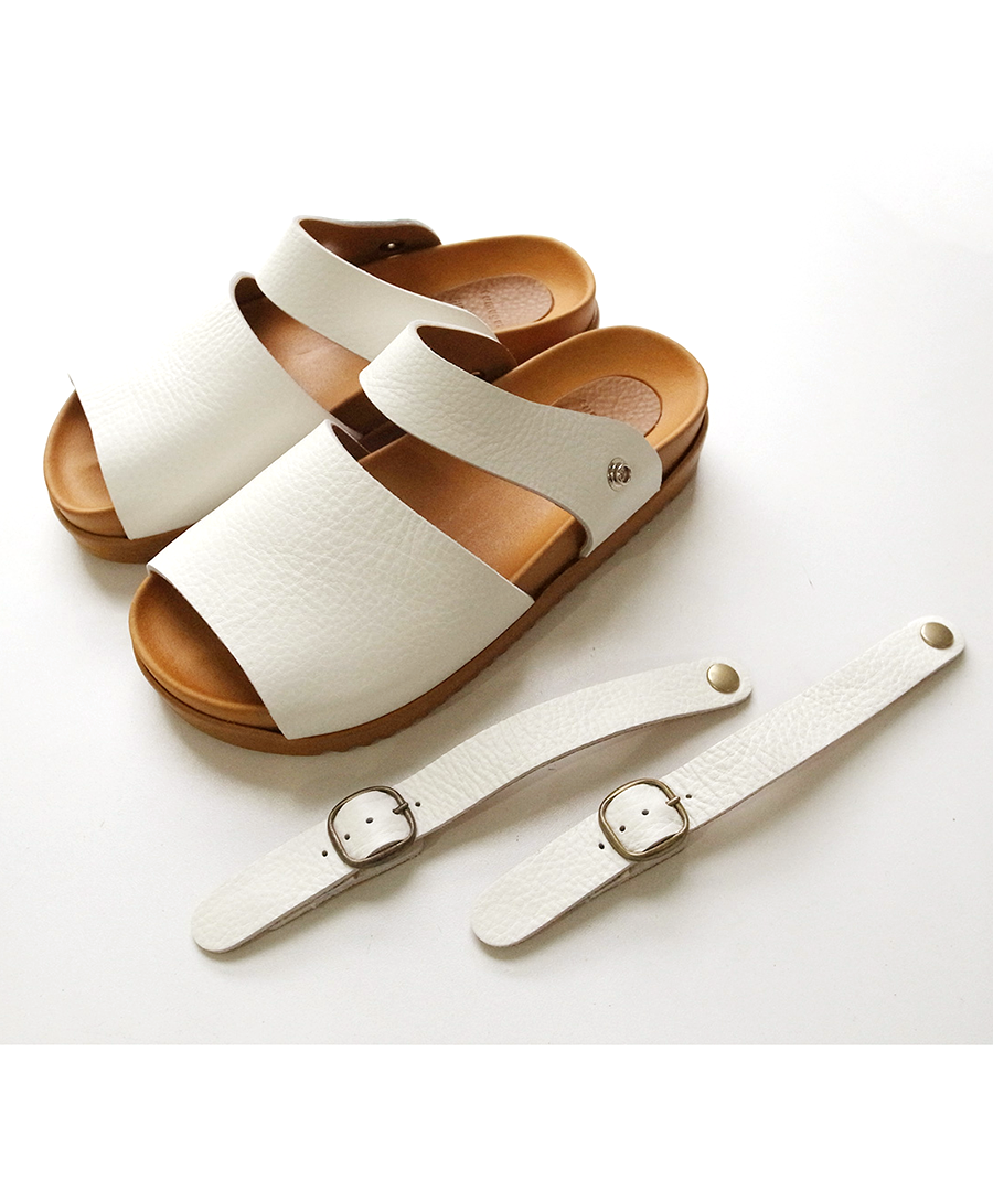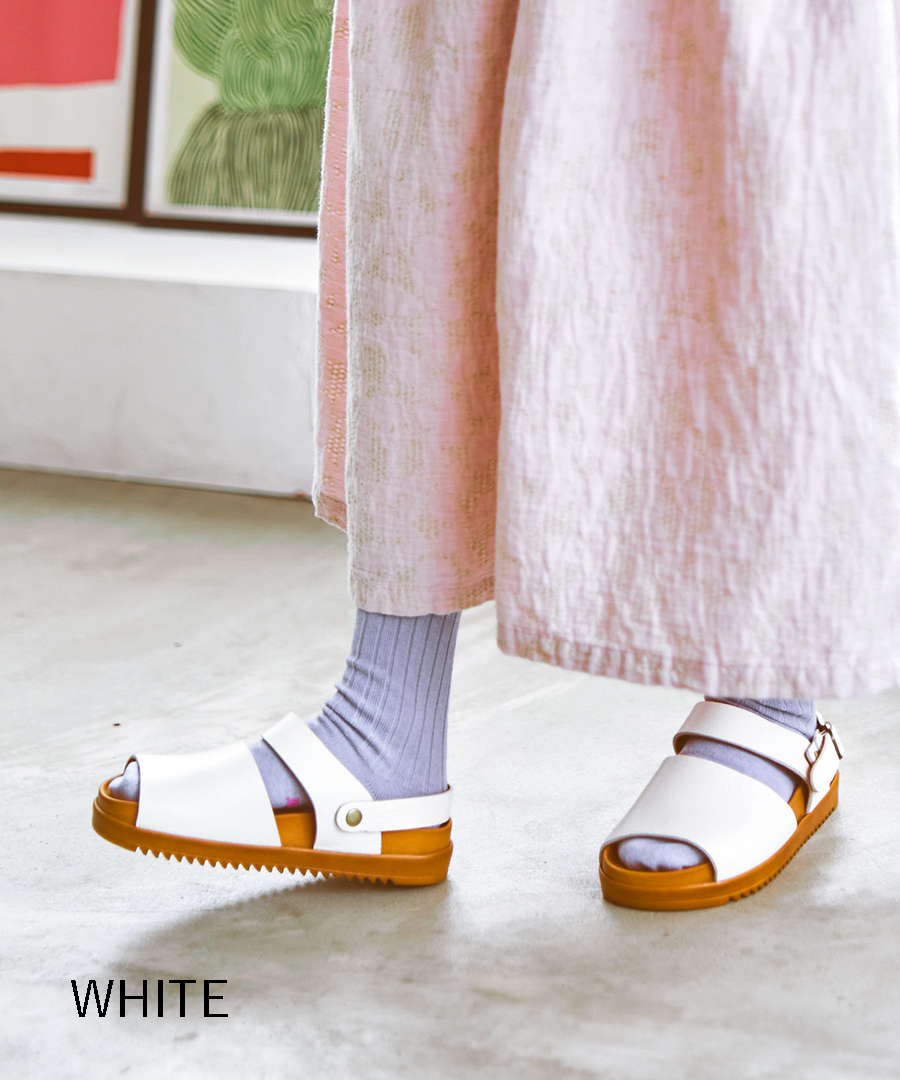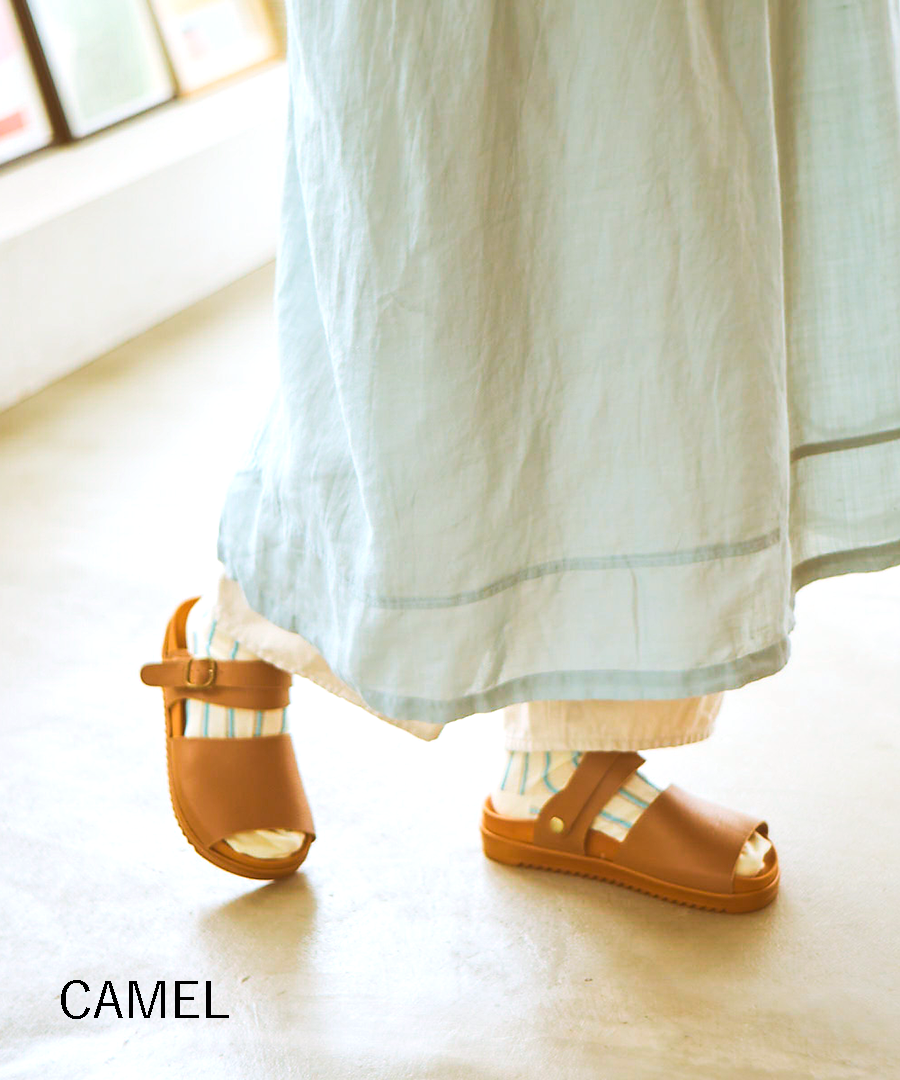 最大の特徴は、シーンに合わせて表情を変えられる2WAY仕様の可動式ベルト。バックベルトとして足をしっかりホールドするのはもちろん、前に倒せばサッと履けるミュールへと早変わりします。バックル部分はゴム仕様なので、ベルトを外す手間なくスムーズに着脱できるのも嬉しいポイント。