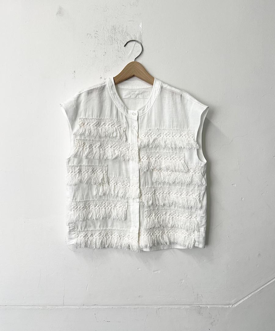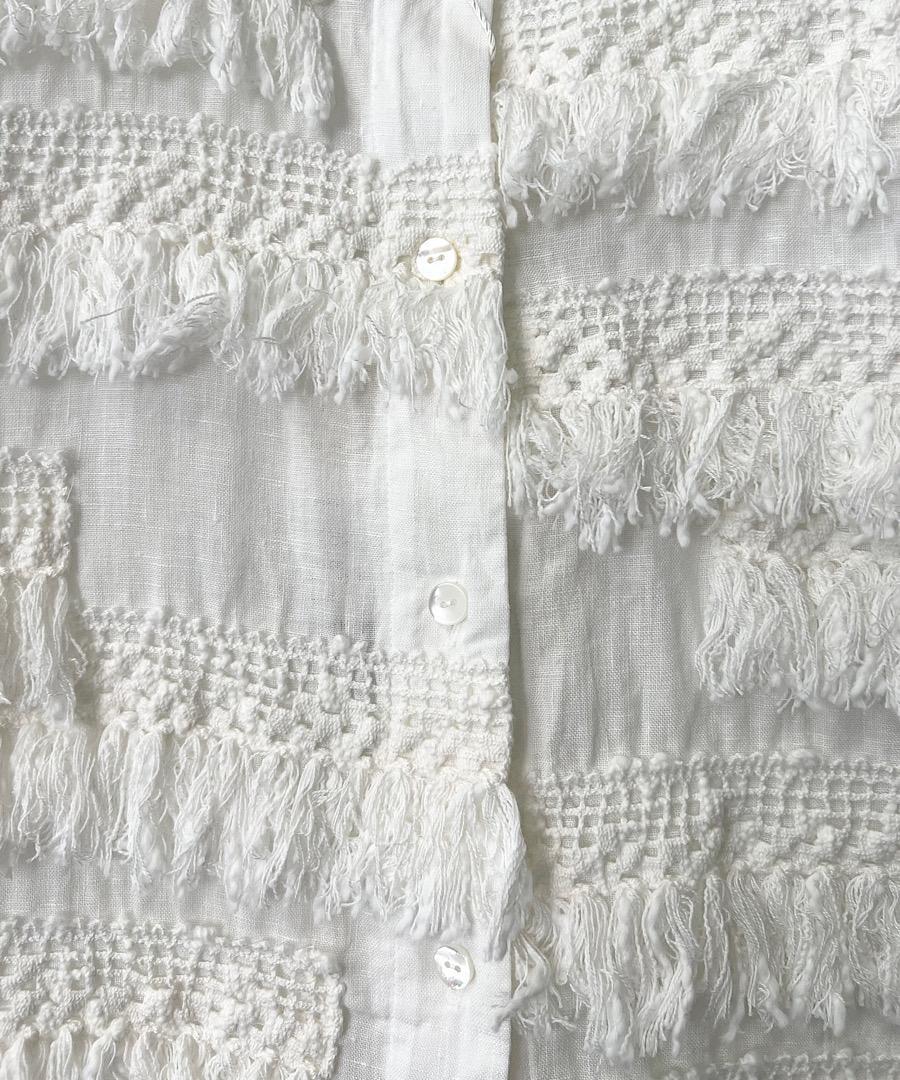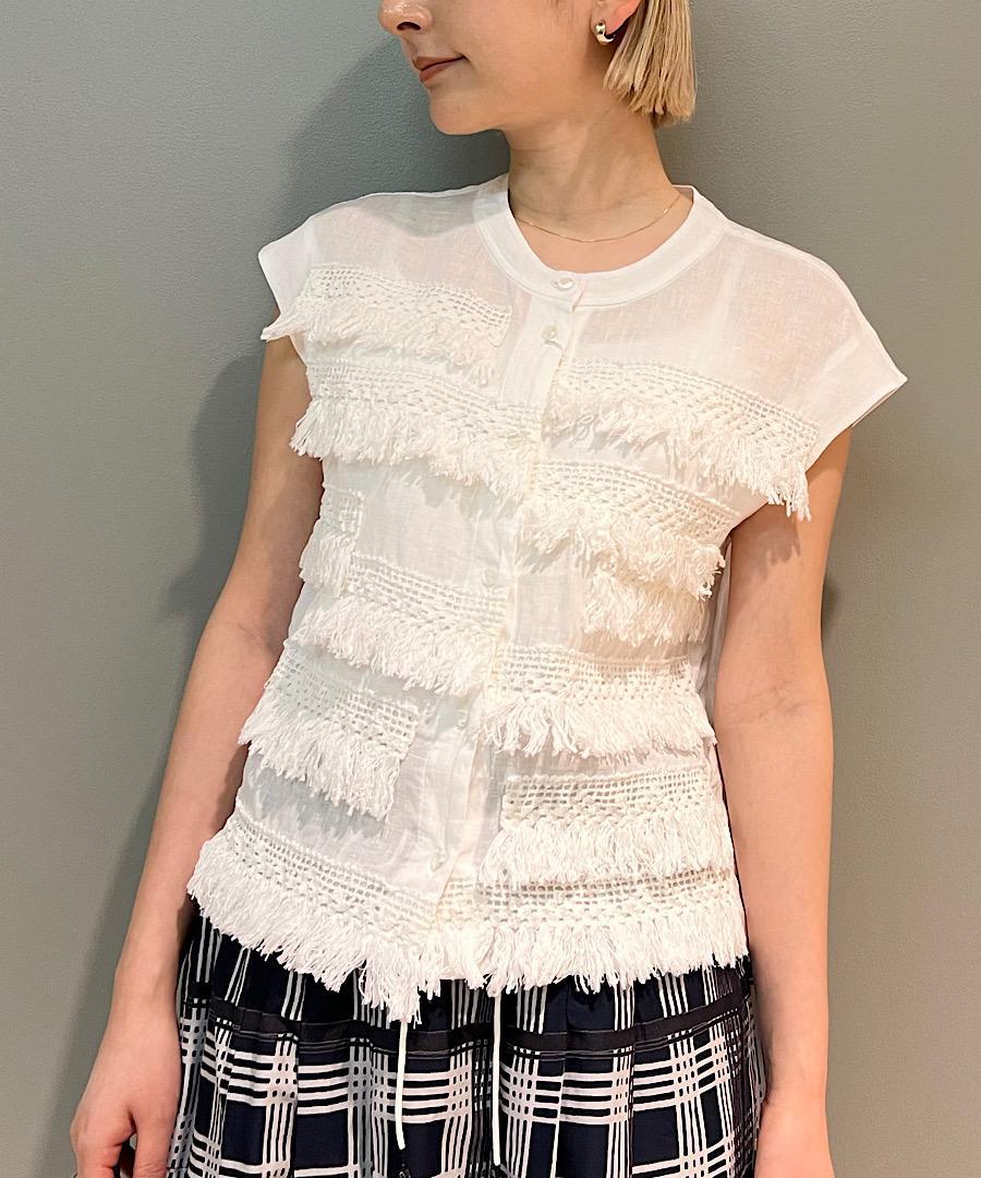 フレンチスリーブで短めの丈感にランダムについたフリンジレースが印象的なアイテム。