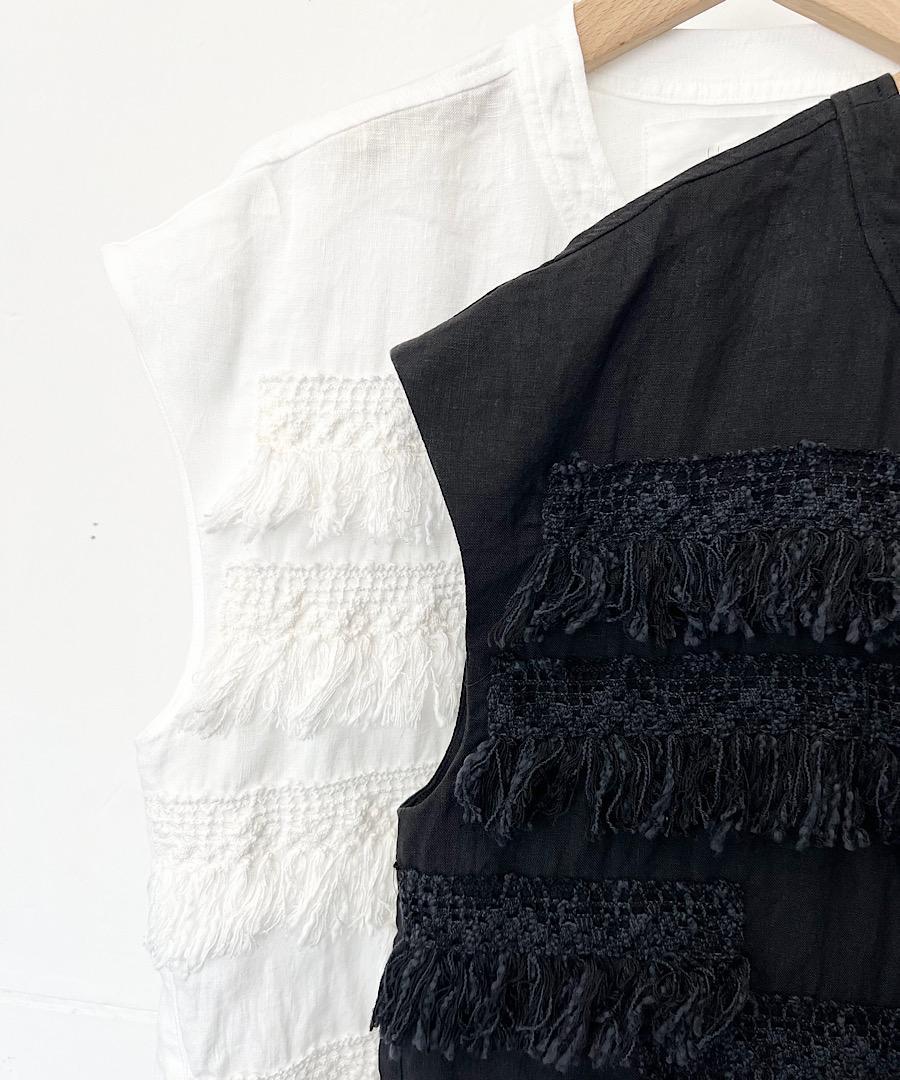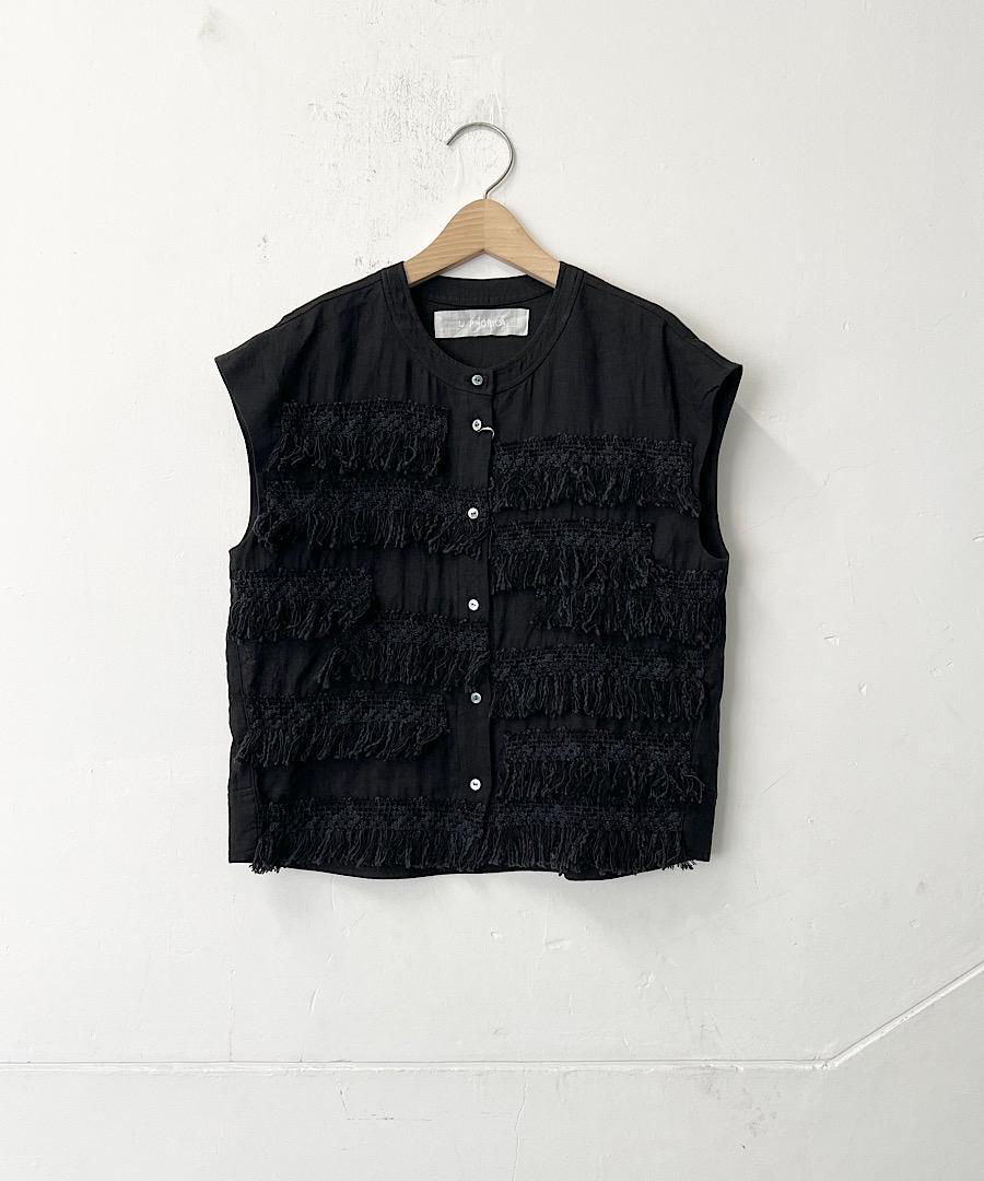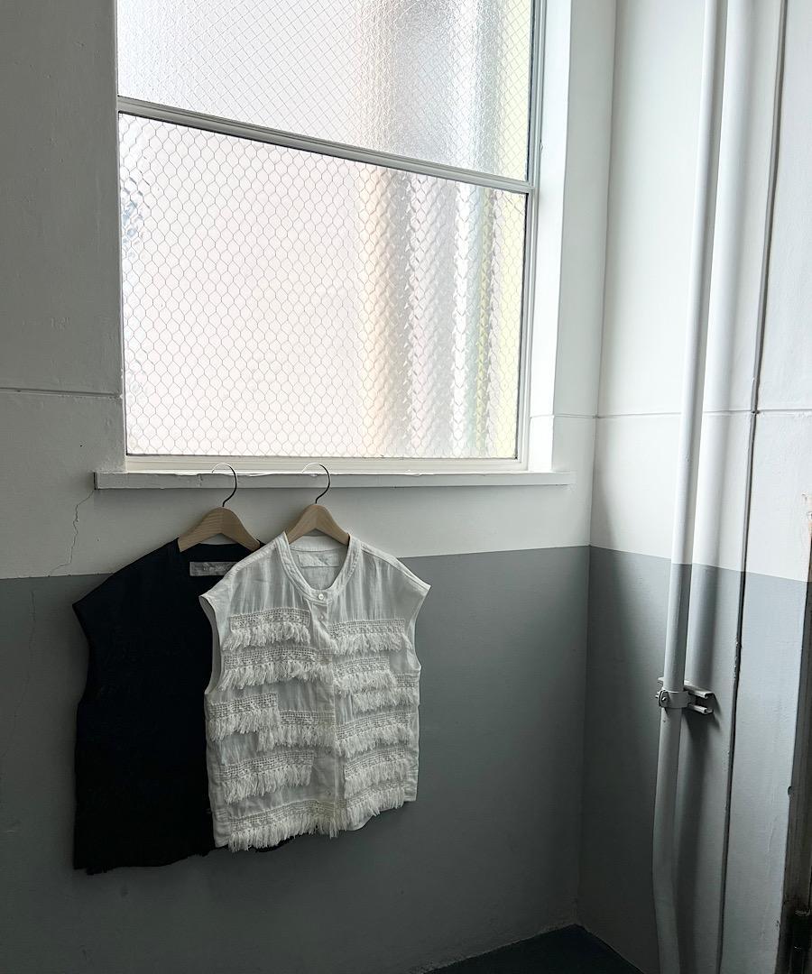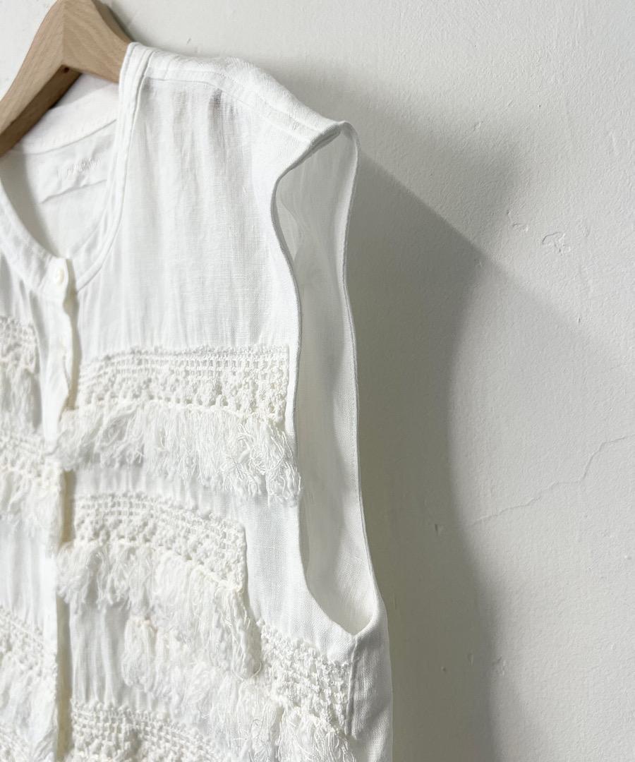 フレンチスリーブで短めの丈感にランダムについたフリンジレースが印象的なアイテム。