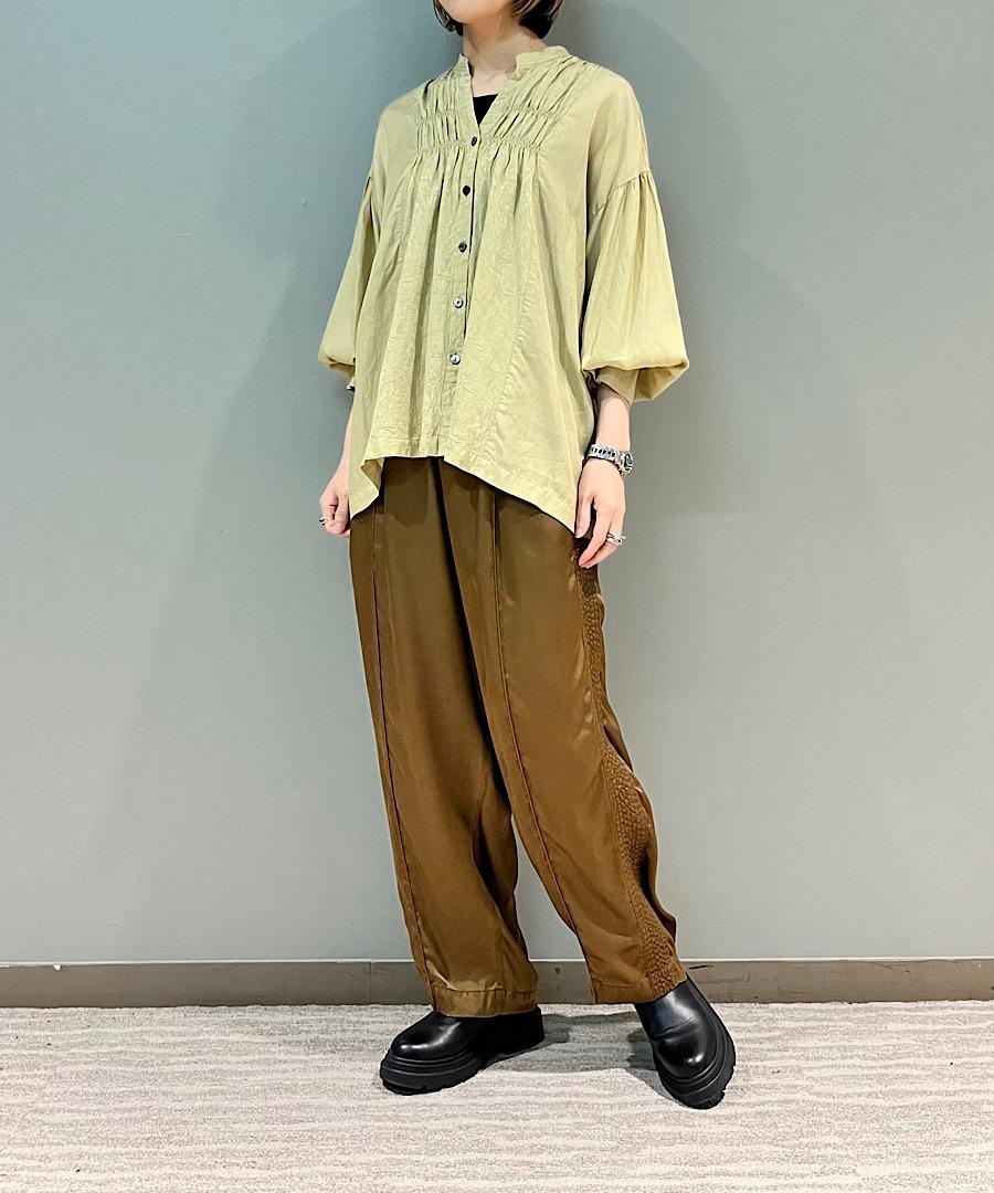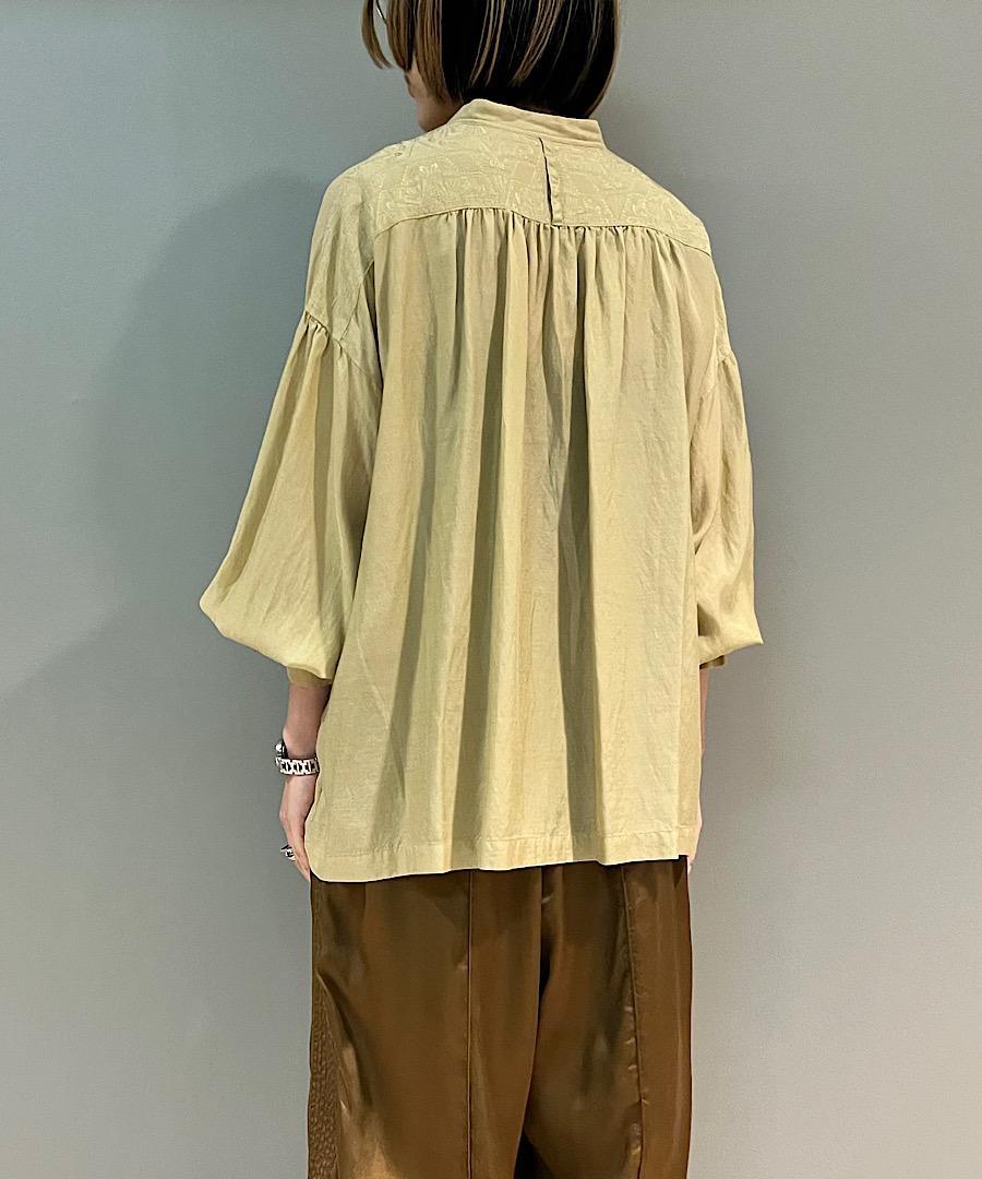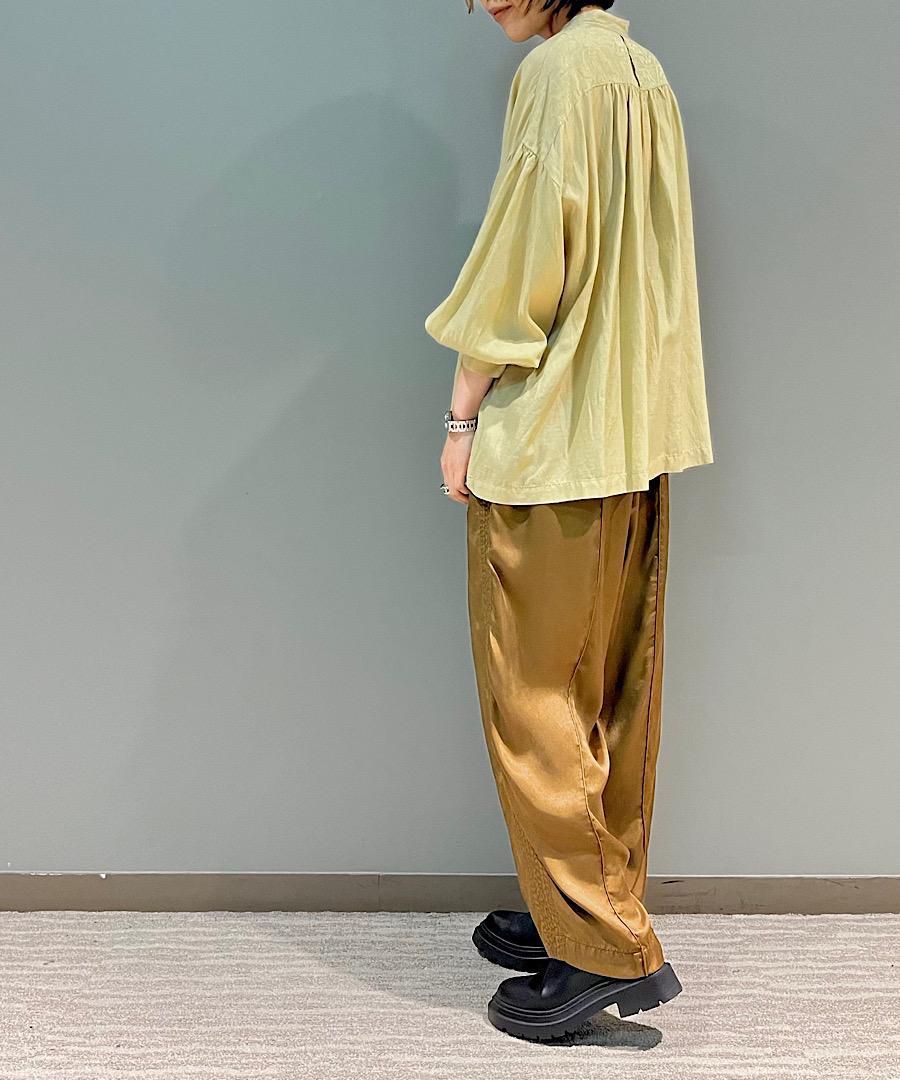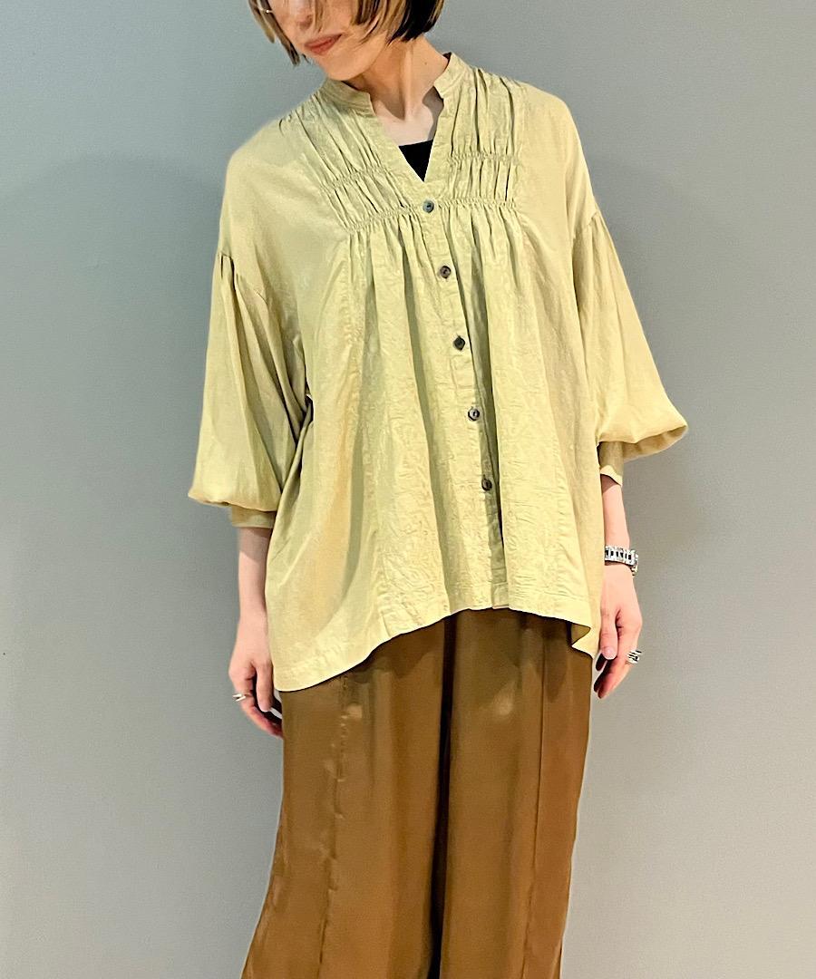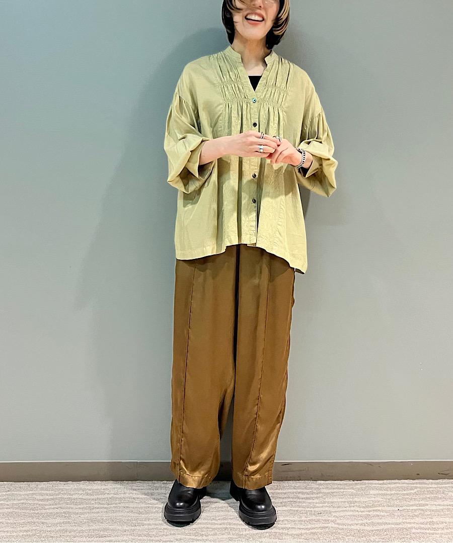 柔らかい落ち感と女性らしい動きのあるギャザーが特徴のスタンドカラーシャツ。