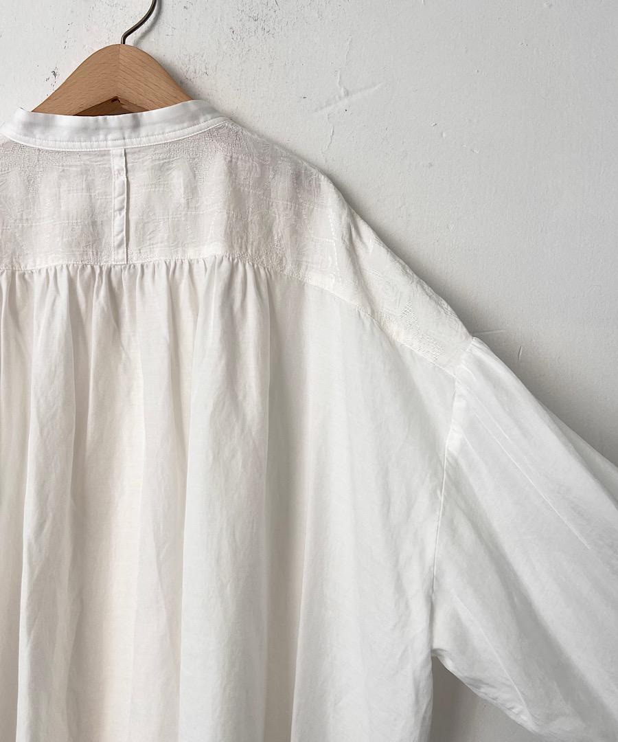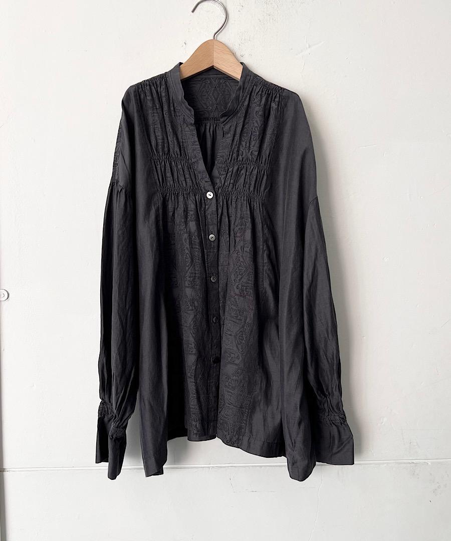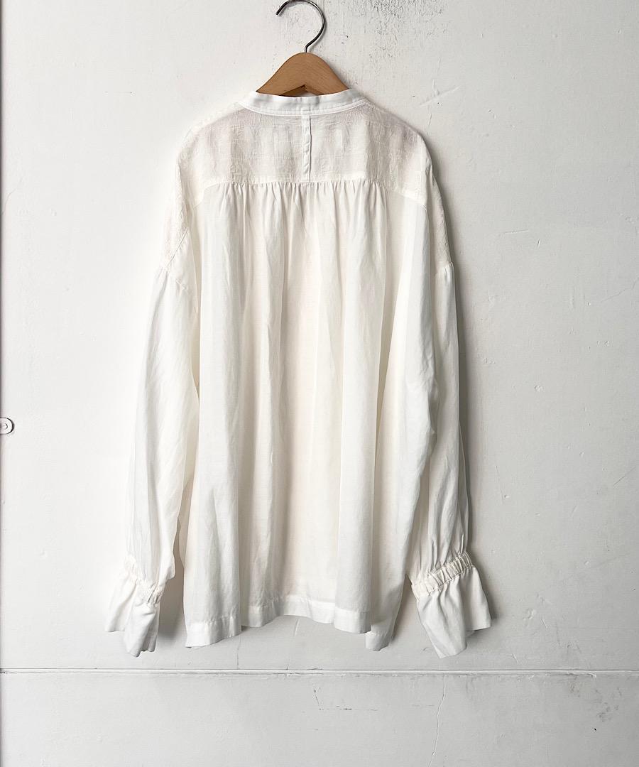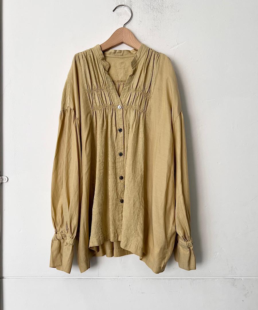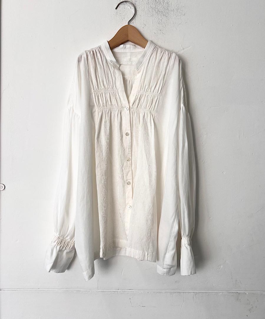 柔らかい落ち感と女性らしい動きのあるギャザーが特徴のスタンドカラーシャツ。