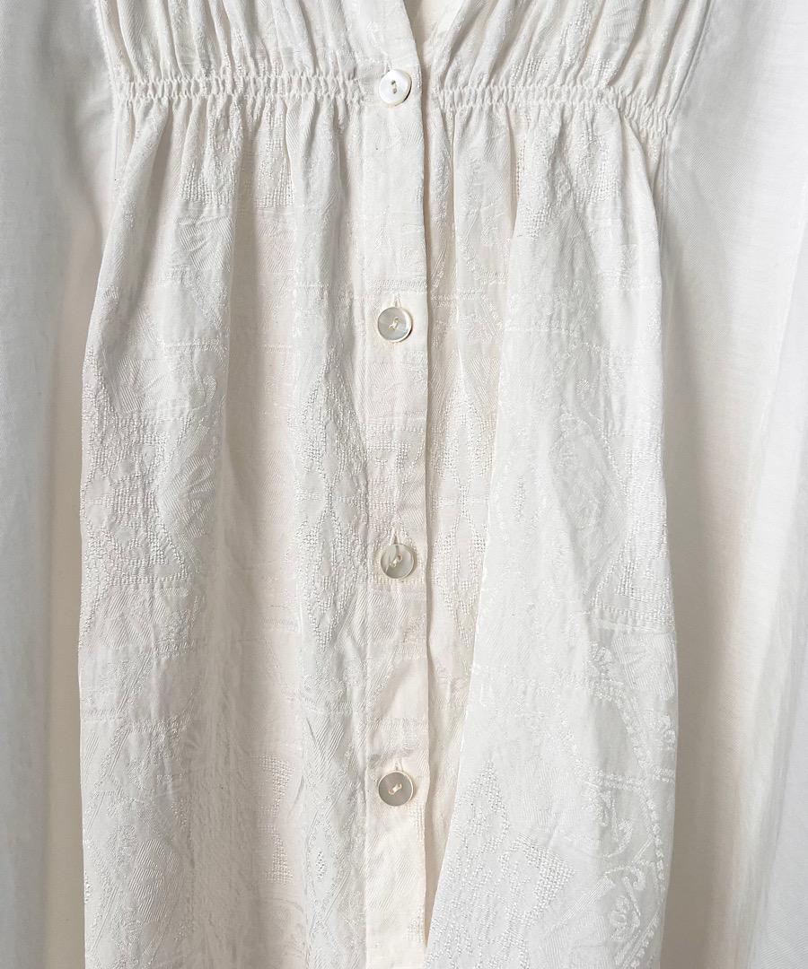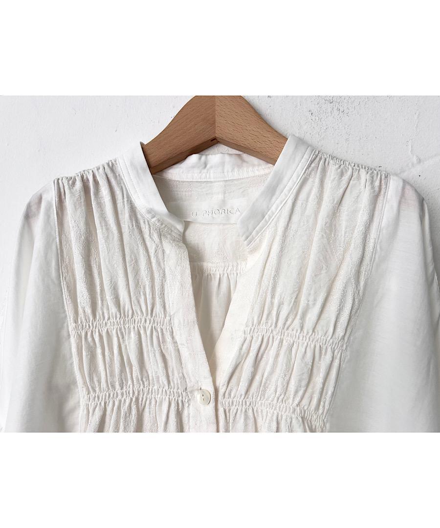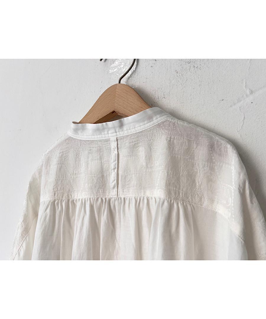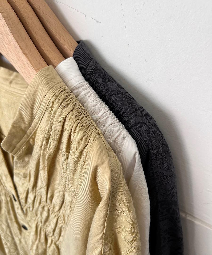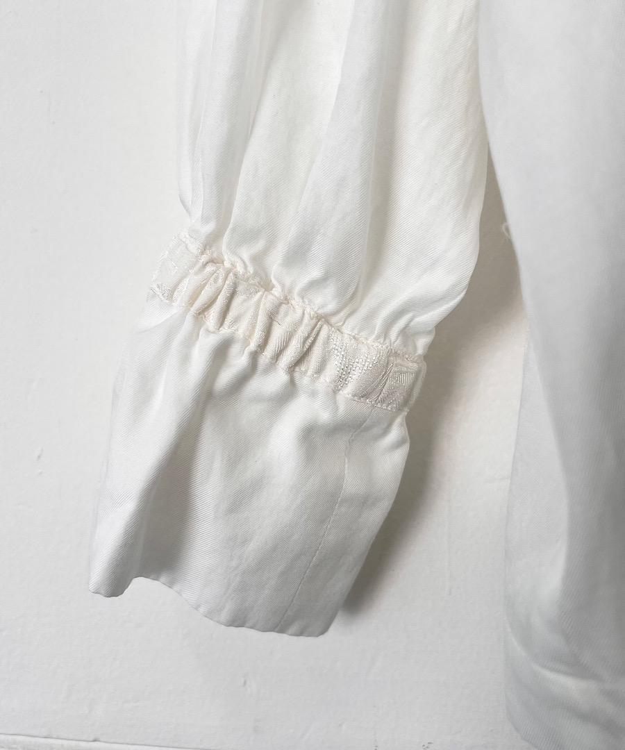 柔らかい落ち感と女性らしい動きのあるギャザーが特徴のスタンドカラーシャツ。