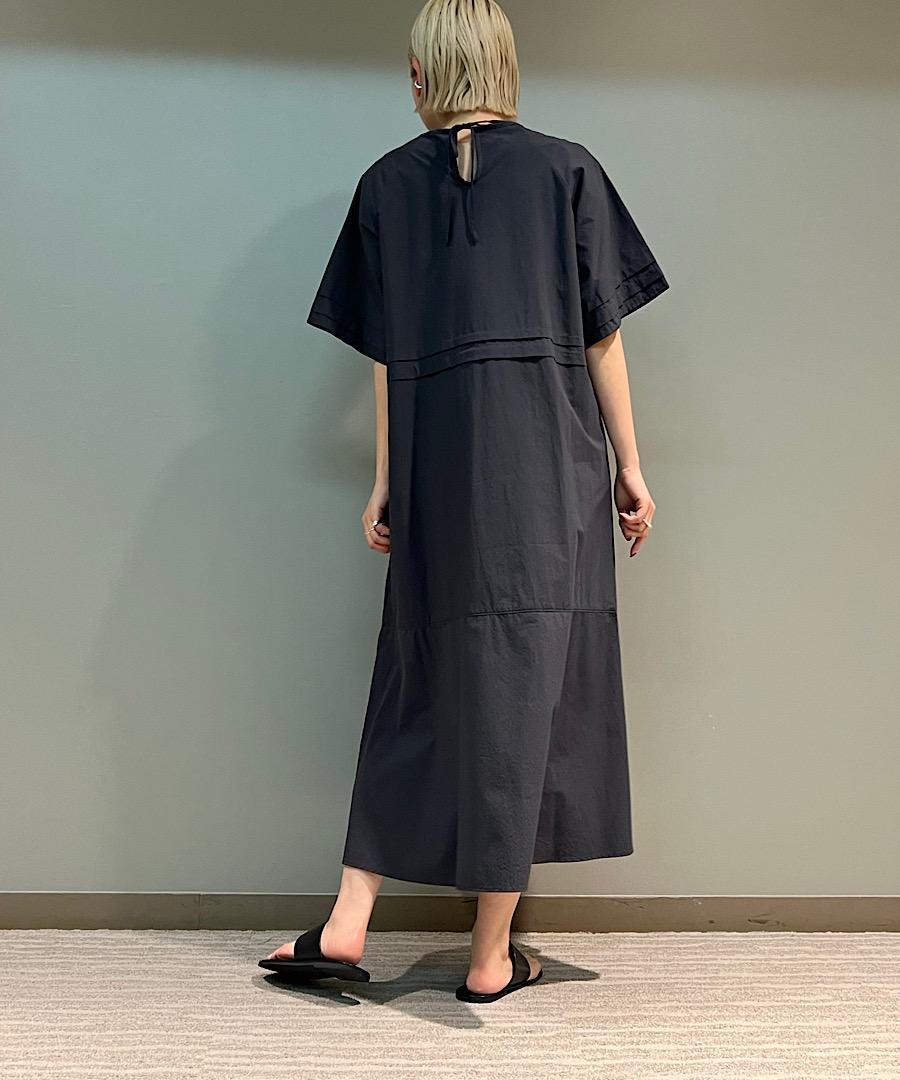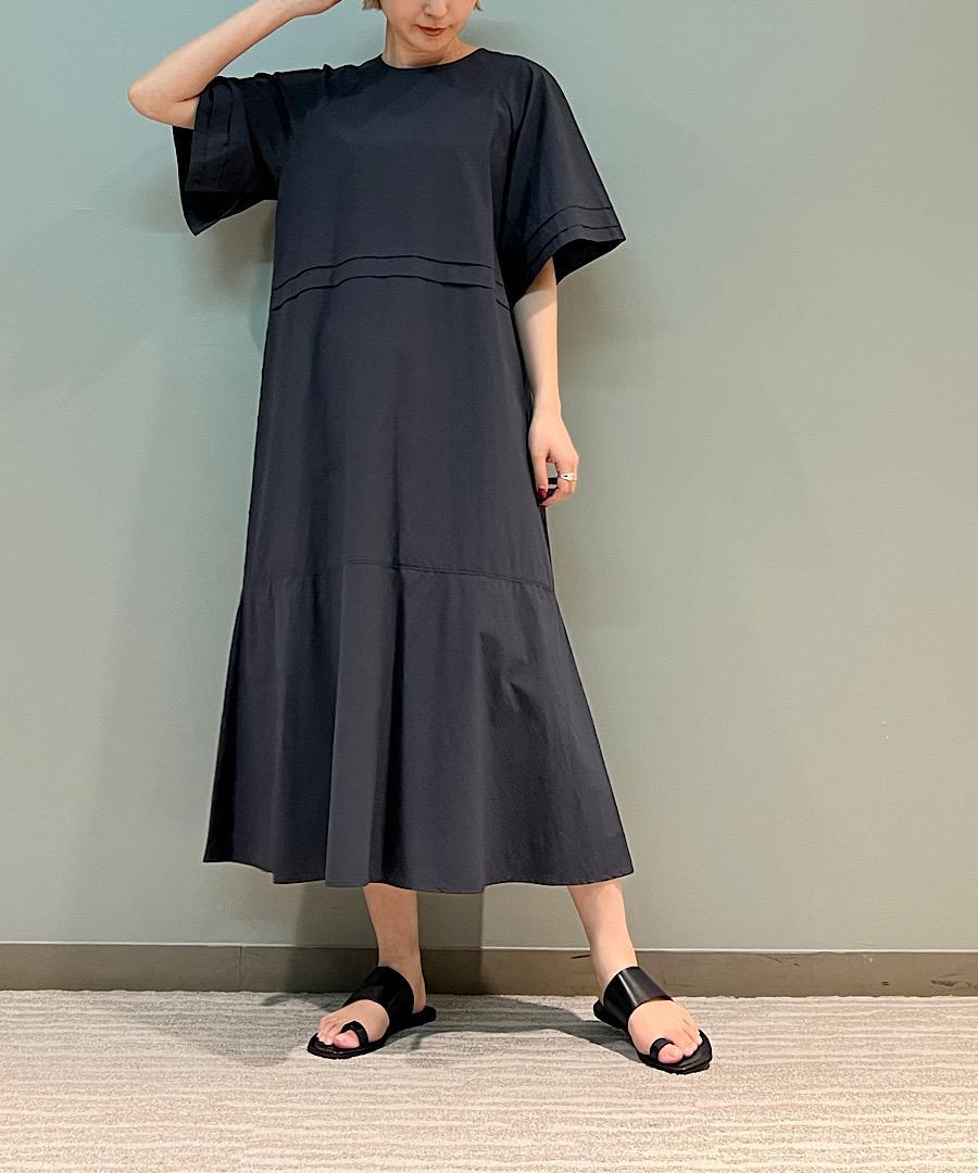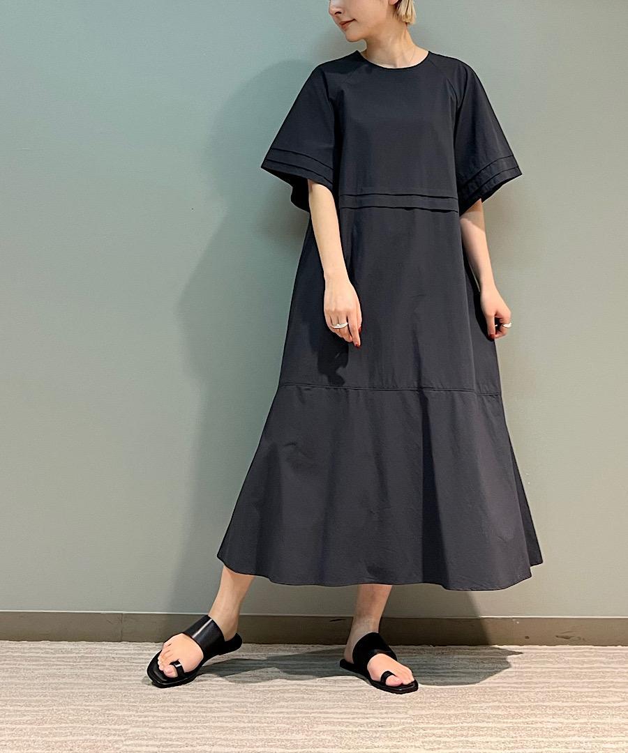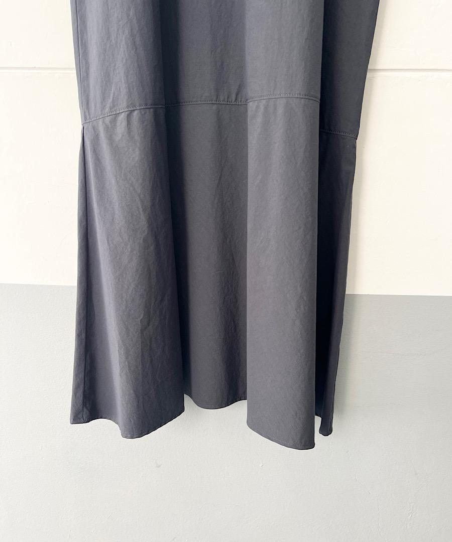 ややフレアに広がった裾が女性らしさと素材のカジュアルさを持ち合わせたアイテム。