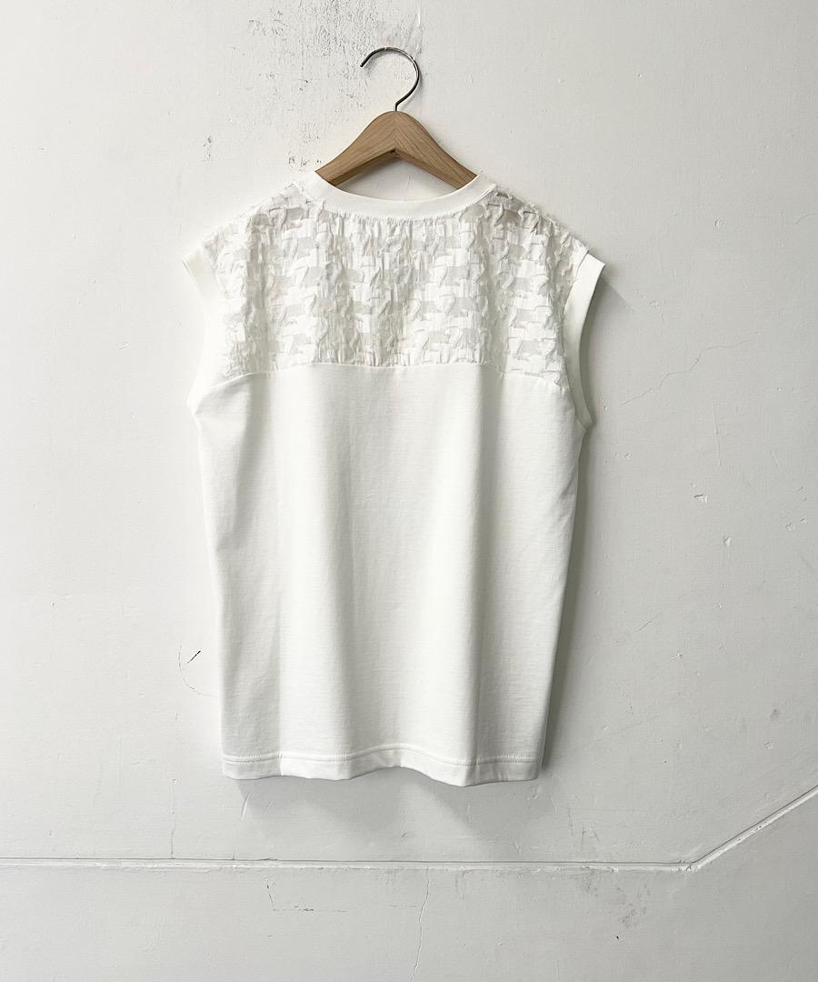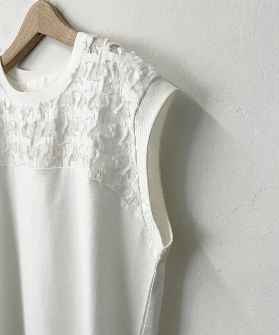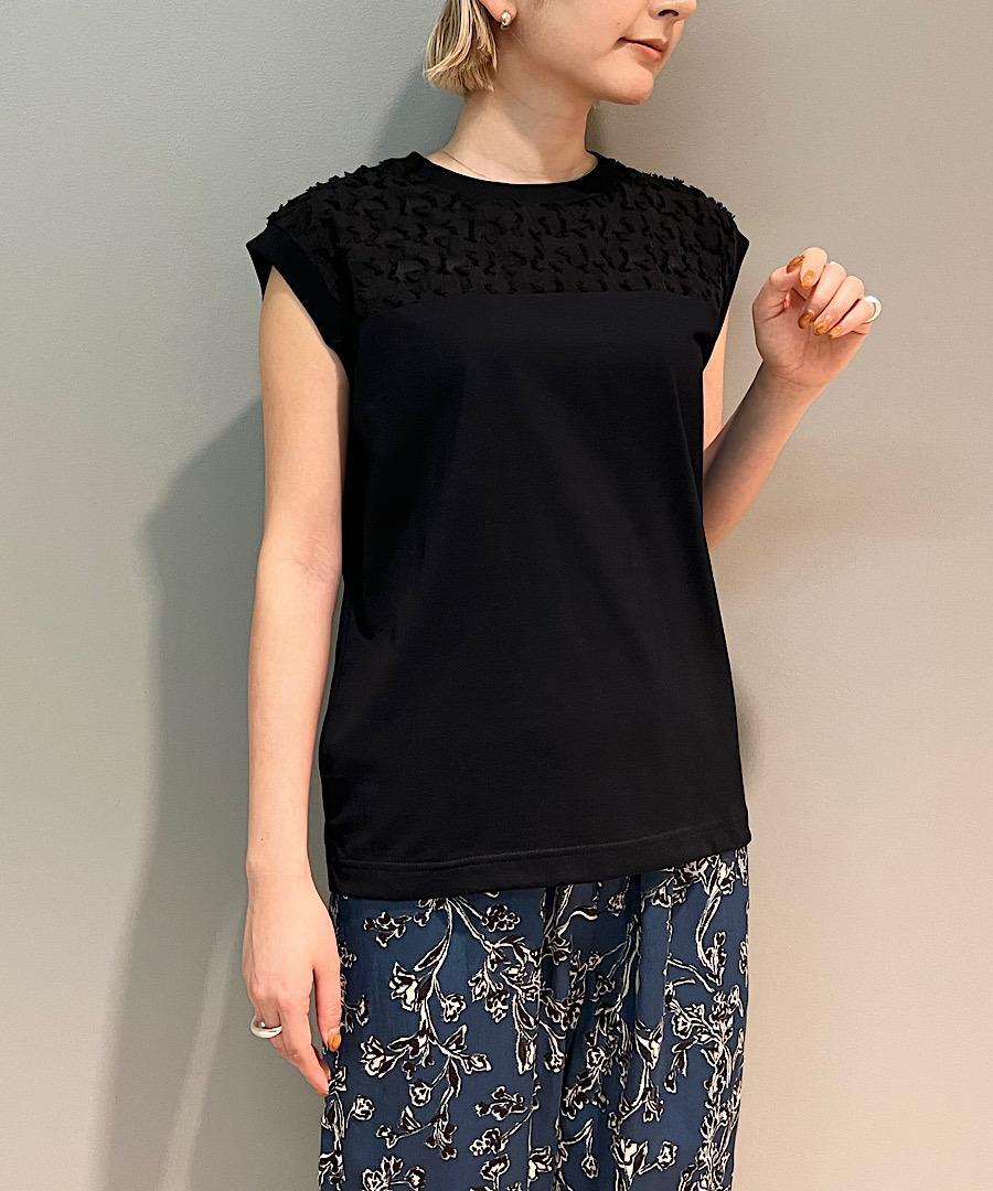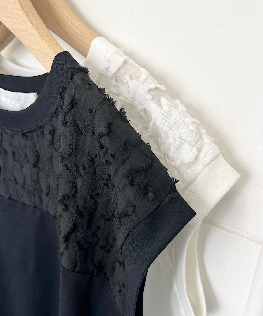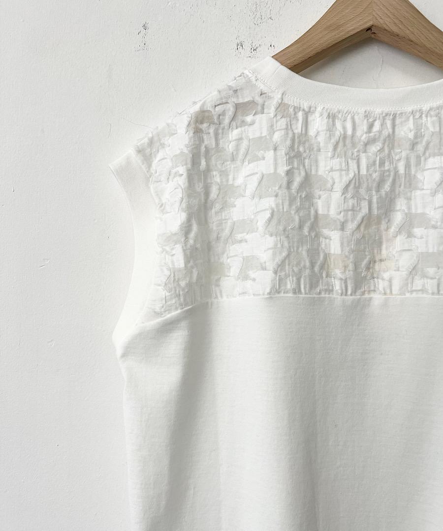 接触冷感のある天竺素材にカットジャガードのマットな綿とキュプラを使用し、陰影を表現した表面感のある生地を組み合わせ上品な仕上がりに。