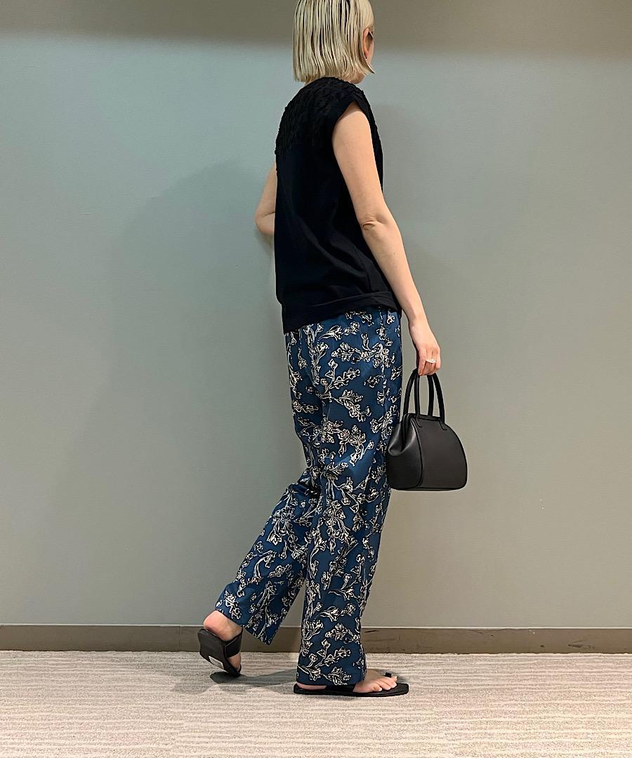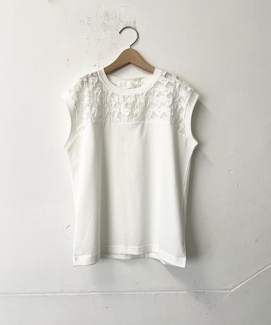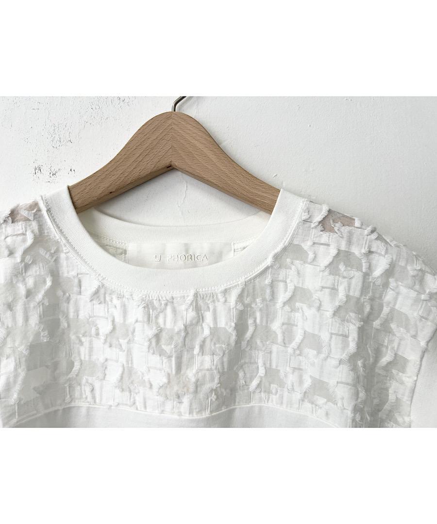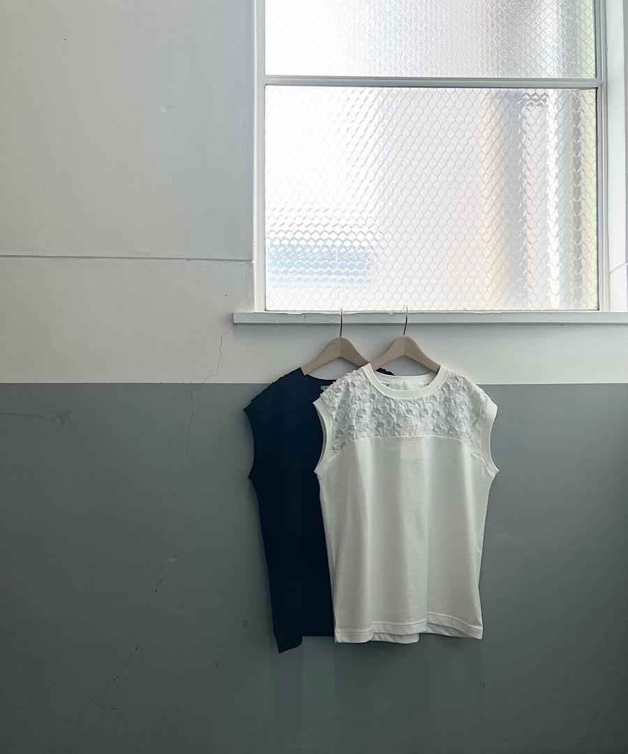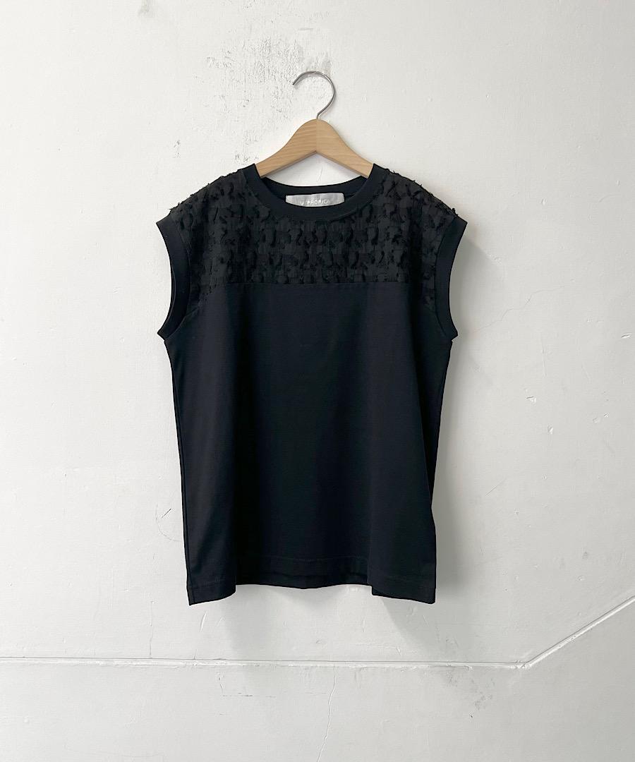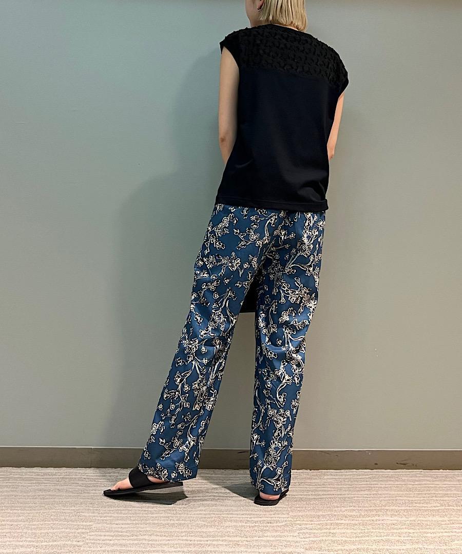 接触冷感のある天竺素材にカットジャガードのマットな綿とキュプラを使用し、陰影を表現した表面感のある生地を組み合わせ上品な仕上がりに。