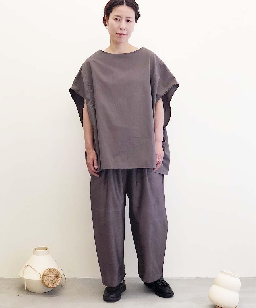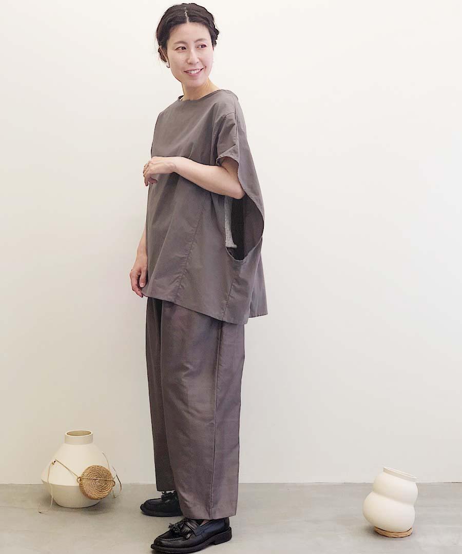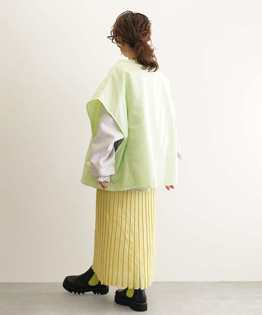 スウェットなど厚手のものとのレイヤードも楽しめます。